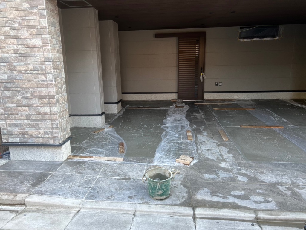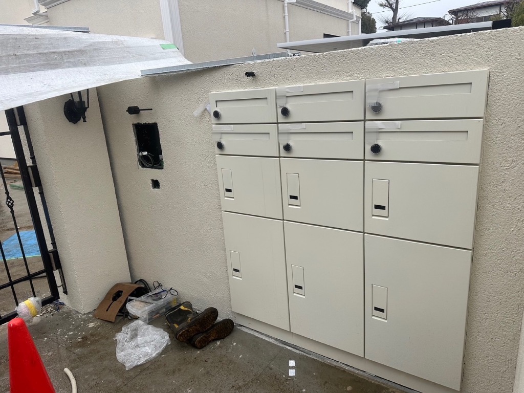 円形デザインの土間コンクリート施工と集合ポスト設置!